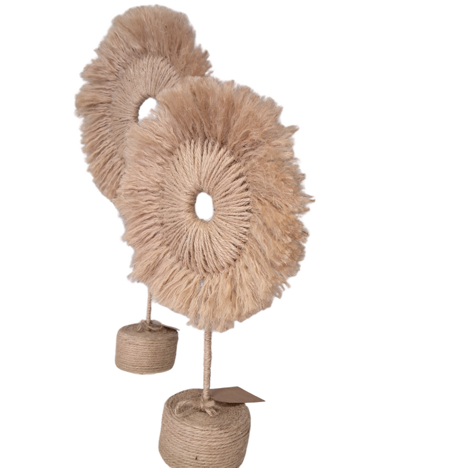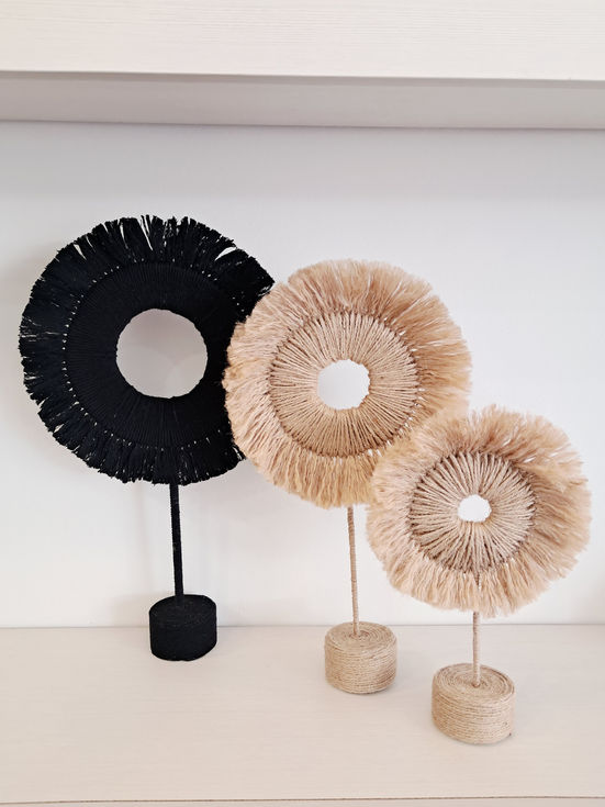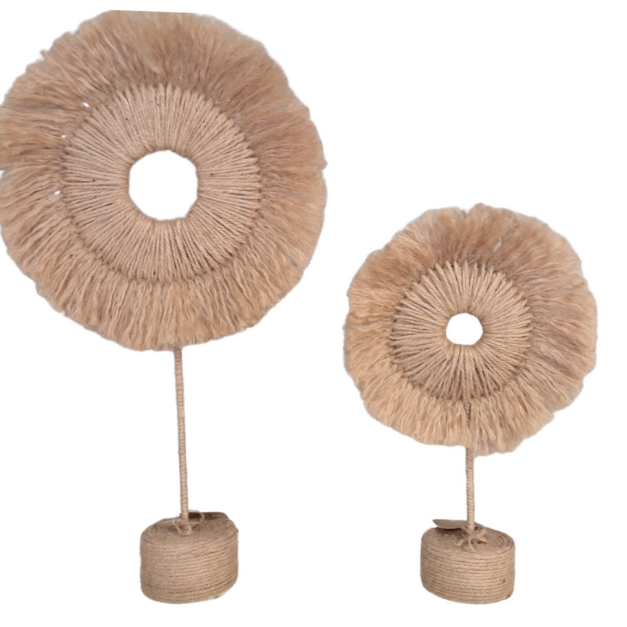 Elevate your décor with a handmade statement piece. Crafted from hand-twisted jute, its circular form and soft fringed edges bring warmth, texture, and a touch of bohemian elegance to any space. Perfect as a stand-alone sculpture or paired in different sizes for a layered look.