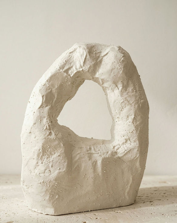Standing at 28cm, its brutalist silhouette is softened by an organic central void, inviting the viewer to look through the piece rather than just at it. The raw, plaster-like finish highlights every "imperfection" of the paper pulp, making it a tactile experience that changes with the shifting light throughout the day.